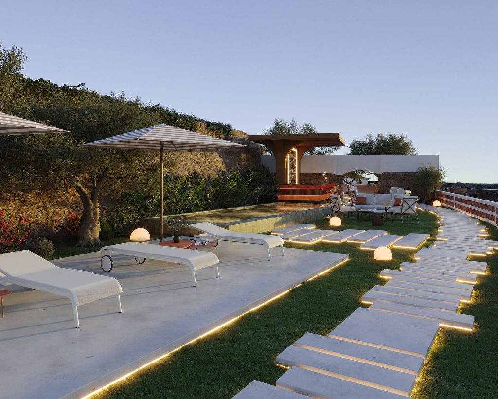 Our pool bar, where the scents of different plants, such as lavender and orange blossom blend with the view over the plains of Moura. The ideal place to take shelter from the Alentejo heat and take a break between dips and sunbathing in our infinity pool.